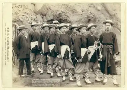 There was a lack of central family units for many Chinese individuals since immigrants were mostly male. The mentality was to further individual economic growth, which was driven by the Gold Rush taking place in the Black Hills.[5] Traditional foods were imported from China and were used habitually.[5] Clothing materials were an assortment of traditional cultural clothing and American clothing. The practice of binding feet occurred among the Chinese community at the end of the 19th century. Also, tobacco and opium were another key social practice within not only the Chinese community but the Deadwood community as a whole. The Chinese community in Deadwood maintained traditional mortuary practices for individuals who died, including parades and placing offerings with the body.[14]