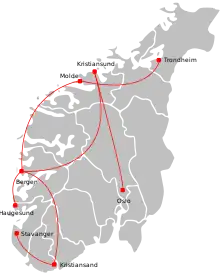 The route Stavanger–Bergen–Trondheim was awarded to Vestlandske Luftfartsselskap in 1956, but this company filed for bankruptcy the following year. Ålesund Airport, Vigra was scheduled to open in 1958, and both Braathens SAFE and SAS applied for the concession, along with the route along the West Coast. At first the ministry wanted to issue the concession on the route Stavanger – Bergen – Ålesund – Trondheim to Braathens SAFE and the route Ålesund–Oslo to SAS. But after negotiations, Braathens SAFE stated they were willing to fly the coastal route without subsidies if they were granted the Oslo-route, since that would allow them to cross-subsidize; this was granted by the ministry. An agreement was then made between the ministry, SAS and Braathens SAFE, where both airlines would fly the routes Oslo–Trondheim, Oslo–Stavanger, Oslo–Kristiansand and Kristiansand–Stavanger–Bergen; Braathens SAFE had a monopoly on the routes Oslo–Ålesund and Bergen–Ålesund–Trondheim, while SAS was granted a monopoly on the routes Oslo–Bergen and (Oslo)–Trondheim–Bodø–Bardufoss.[19] In 1958, Braathens SAFE had 77,591 passengers.[20]