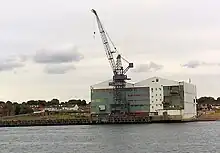 The Royal Navy also had a large building situated between Archery Road and the waterfront[11] which they used as stores. Originally built in 1917 by the Ministry of Munitions as Rolling Mills for the production of brass strip for shell cases, this building is often thought of and referred to as being within Woolston but it was actually in the neighbouring district of Weston.[1][3] It was built immediately behind Weston Grove House[1] on land that was originally part of the Weston Grove estate.[12]
