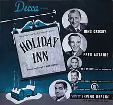 Holiday Inn is a 1942 American musical film starring Bing Crosby and Fred Astaire, with Marjorie Reynolds, Virginia Dale, and Walter Abel.[2] It was directed by Mark Sandrich with music by Irving Berlin. The composer wrote twelve songs specifically for the film, the best known being "White Christmas". The film features a complete reuse of the song "Easter Parade", written by Berlin for the 1933 Broadway revue As Thousands Cheer and used as a highlight of the 1948 film Easter Parade, starring Astaire and Judy Garland. The film's choreography was by Danny Dare.[3]