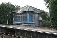 The original 1877 signal box remains on the London bound platform although now disused. The signal box is Grade II listed.[4]