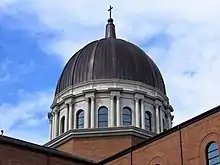 The 162-ton copper-clad ribbed dome was constructed on the ground and lifted into place via crane in a remarkable feat by the contractor.[9] A decorative finial and a cross embellish the top of the dome, which reaches to a total height of 173 feet above the ground. The drum of the dome, adorned with a range of paired Corinthian columns and entablature and sixteen arched windows, is located directly above the sanctuary platform below it.