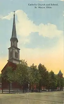 St. Marys' first Catholics settled in the community in 1831.[2] Their numbers greatly increased in the 1840s with the construction of the Miami and Erie Canal and of Grand Lake St. Marys.[3] At this time, large numbers of German Catholics were taking up residence in the plains of western Ohio near St. Marys, and priests of the Society of the Precious Blood became established in Minster,[4]: 7 about 10 miles (16 km) to the south of St. Marys.[5]: 45, 55 For twenty years, the community's Catholics often travelled to Minster for Mass;[2] this situation ended with the erection of Holy Rosary parish in 1852.[6] In its early years, the parish was administered in conjunction with St. Thomas parish in nearby Six Mile,[3] almost 5 miles (8.0 km) to the northeast.[5]: 45