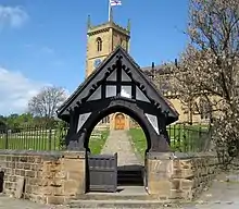 Although largely rebuilt in 1873 the church has some late medieval fabric. It is built of Sandstone ashlar with a slate roof. The church has a west tower built in three stages with diagonal buttresses, a clockface on its southside and belfry windows of two cusped lights.[3] The church has a lychgate dating from 1889.