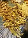 ![]() | It is cut into slices and placed on a bamboo skewer. The outer side is fried until orange colour and the inside is filled with grease and fat. |