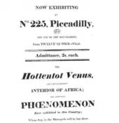 Dunlop had to have Baartman exhibited and Cesars was the showman. Dunlop exhibited Baartman at the Egyptian Room at the London residence of Thomas Hope at No. 10 Duchess Street, Cavendish Square, London. Dunlop thought he could make money because of Londoners' lack of familiarity with Africans and because of Baartman's pejoratively perceived large buttocks. Crais and Scully say: "People came to see her because they saw her not as a person but as a pure example of this one part of the natural world".[4] She became known as the "Hottentot Venus" (as was at least one other woman, in 1829[13]). A handwritten note made on an exhibition flyer by someone who saw Baartman in London in January 1811 indicates curiosity about her origins and probably reproduced some of the language from the exhibition; thus the following origin story should be treated with skepticism: "Sartjee is 22 Years old is 4 feet 10 Inches high, and has (for a Hottentot) a good capacity. She lived in the occupation of a Cook at the Cape of Good Hope. Her Country is situated not less than 600 Miles from the Cape, the Inhabitants of which are rich in Cattle and sell them by barter for a mere trifle. A Bottle of Brandy, or small roll of Tobacco will purchase several Sheep – Their principal trade is in Cattle Skins or Tallow. – Beyond this Nation is an other, of small stature, very subtle & fierce; the Dutch could not bring them under subjection, and shot them whenever they found them. 9 Jany, 1811. [H.C.?]"[14] The tradition of freak shows was well established in Europe at this time, and historians have argued that this is at first how Baartman was displayed.[4] Baartman never allowed herself to be exhibited nude,[15] and an account of her appearance in London in 1810 makes it clear that she was wearing a garment, albeit a tight-fitting one.[16] She became a subject of scientific interest, albeit of racist bias frequently, as well as of erotic projection.[17] She was marketed as the "missing link between man and beast".[10]