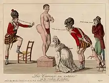 A man called Henry Taylor took Baartman to France around September 1814. Taylor then sold her to a man sometimes reported as an animal trainer, S. Réaux,[23] but whose name was actually Jean Riaux and belonged to a ballet master who had been deported from the Cape Colony for seditious behaviour.[7] Riaux exhibited her under more pressured conditions for 15 months at the Palais Royal in Paris. In France she was in effect enslaved. In Paris, her exhibition became more clearly entangled with scientific racism. French scientists were curious about whether she had the elongated labia which earlier naturalists such as François Levaillant had purportedly observed in Khoisan at the Cape.[23] French naturalists, among them Georges Cuvier, head keeper of the menagerie at the Muséum national d'Histoire naturelle and founder of the discipline of comparative anatomy, visited her. She was the subject of several scientific paintings at the Jardin du Roi, where she was examined in March 1815.[6][4]: 131–134