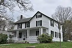 102 Staniford Street stands in a residential area north of the village center of Auburndale, on the east side of Staniford Street north of West Pine Street. It stands on over 1 acre (0.40 ha) of land, along with a 19th-century barn that has been repurposed into housing. The house is a 2+1⁄2-story wood-frame structure, that is basically T-shaped with a cross-gabled roof. The original main block is oriented facing south, but subsequent modifications have relocated the main entrance to the west side of the north-facing T leg. A single-story porch extends across the western facade, decorated with latticework balustrade and posts. A nod is made to Italianate styling with a round-arch window in the west-facing gable.[2]