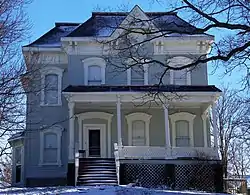 This house shows the development of the Italianate form in Davenport from the Joseph Mallet House and the Joseph Motie House, both of which were built earlier.[2] This particular house is a good example of the Vernacular-Italianate style that was popular in Davenport after the Civil War.[3] It features projections from the box-like form, bracketed eaves, curved window hoods, and decorative elements cut by jig and scroll saws.[2] The arched window surrounds, the front porch with the Corinthian order column caps, the bracketed cornice, and the unusual gable with decorative millwork apron and the bargeboards above the central oculus are all original to the house.[3] Some of these elements are also found locally on Second Empire style houses. Its complex plan and roofscape, exemplified here by the full-height projecting window bays and gabled dormers toward the back of the structure, would be a feature of later Victorian architecture in Davenport.