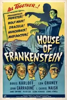 House of Frankenstein is a 1944 American horror film starring Boris Karloff, Lon Chaney Jr. and John Carradine. Based on a story by Curt Siodmak, it was directed by Erle C. Kenton and produced by Universal Pictures. The film is about Dr. Gustav Niemann, who escapes from prison and promises to create a new body for his assistant Daniel. Over the course of the film, they encounter Count Dracula, Larry Talbot, the Wolf Man, and Frankenstein's Monster.