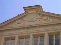 Its arms are "d’azur au chevron d’or accompagné de trois croisettes ancrées du même".