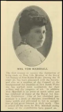 A well-known patron of the arts in Sydney, her role was recognised in 1929, along with that of her solicitor husband, Thomas Marshall, when they were made life-long members of the Royal Art Society, along with Dame Eadith Walker and Dame Nellie Melba.[15][16][17][11][12][18]