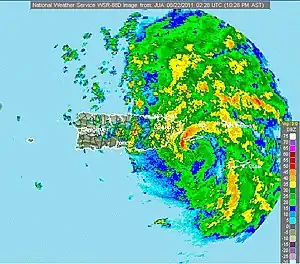 Irene was positioned about 190 mi (310 km) east of Dominica in the Lesser Antilles when it was classified and named, along weakening high pressure over the west-central Atlantic, inducing a roughly west-northwestward path for most of its journey through the eastern Caribbean.[9] Its mid-level circulation continued to become better established as hints of pronounced banding features curved north of the surface center.[10] On August 21, the surface center reformed closer to the deepest convection; furthermore, an anticyclone aloft provided supportive outflow over the cyclone. With the improved structure, as well as light wind shear and high sea surface temperatures, Irene was forecast to strengthen to near hurricane force prior to landfall in Hispaniola.[11][12] Over the subsequent day (August 22), while passing near the island of Saint Croix in the U.S. Virgin Islands,[13] Irene traced toward Puerto Rico, more northward than initially expected, where it underwent a considerable increase in strength and organization.[14] Hours later, Irene moved ashore, approaching from the southeast near Punta Santiago, Humacao, Puerto Rico, with estimated sustained winds of 70 mph (110 km/h).[15] Despite the storm's interaction with land, radar imagery showed a ragged eye-like feature, and Doppler weather radar data indicated wind speeds in excess of hurricane force. Just after its initial landfall, Irene was accordingly upgraded to a Category 1 hurricane, the first of the 2011 Atlantic hurricane season.[16]