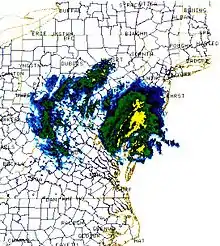 Since 1950, 144 known hurricanes, tropical storms and tropical depressions have affected the U.S. state of Maryland. Many of these storms also affect the country's capital, Washington, D.C., since the city is located on territory ceded by Maryland. Hurricanes are the most intense classification of these storms, while tropical storms and tropical depressions are generally weaker. The Delmarva Peninsula is often affected by cyclones that brush the East Coast.[1] Central and Western Maryland, as well as Washington, D.C., commonly receive rainfall from the remnants of storms that make landfall elsewhere and track northward.[2] On rare occasions, the area experiences the effects of Pacific storms; one such example of this is Hurricane Tico, which made landfall on Mexico and moved inland.