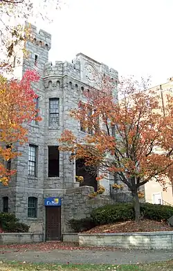 The Hyattsville Armory is a historic National Guard armory built in 1918 and located in Hyattsville, Prince George's County, Maryland, United States. It was the first Armory built in Prince George's County and the fifth in Maryland. Its architect, Robert Lawrence Harris, served as State Architect under Governor Albert C. Ritchie. In this capacity, Harris supervised the design of similar armories in Salisbury, Kensington, Silver Spring, Hagerstown, Laurel, Easton, Crisfield, Pocomoke City, Centreville, and Cumberland. The structure is distinctly fortresslike and offers a commanding view of the surrounding area. The building is patterned after a medieval English castle and built of native stone, with rectangular turrets flanking the arched limestone entranceway. Carved above the entry is the State Seal of Maryland.[2]