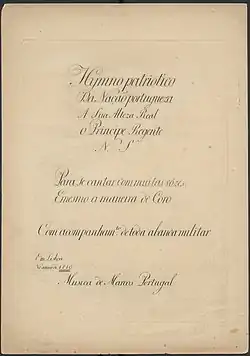 The Hino Patriótico (archaic orthography: Hymno Patriotico da Nação Portugueza; English: "Patriotic Hymn of the Portuguese Nation") was considered Portugal's first national anthem.[1] Marcos Portugal, who had remained living in Portugal, had, in 1808, initially named the piece as 'the Prince's Hymn' (D. João VI Hymn). With this dedication, it was offered to the prince regent D. John and first performed for him in Brazil in 1809. The anthem was inspired by the cantata "La Speranza o sia l’Augurio Felice". The lyrics changed several times, altered by contemporary events, until settling into a more or less permanent form in 1821.[2]