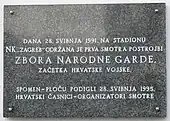 At the onset of the Croatian War of Independence one of the most significant date in the history of the stadium is the first public lineup of the Croatian National Guard (Croatian: Zbor narodne Garde), formed in April that year, consisting of members of the police and part of the Croatian army on 28 May 1991. which was the first Croatia's professional military unit and which later evolved into the Croatian Ground Army (Croatian: Hrvatska kopnena vojska).That marked the beginning of the creation of the Croatian Armed Forces. A commemorative plaque honouring the event can be seen at the stadium entrance.[7]