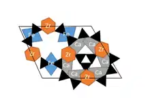 The crystal structure of ikranite can be described as a framework of three- and nine- member SiO4 tetrahedra rings, connected by Ca six-membered rings and Zn (Ti, or Nb) octahedra. Layers are constructed along the c axis as Si-Zr-Si-Ca. This repetition generates 12 layers, equal to ~30Å in size.[4]