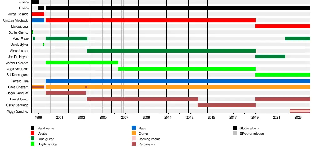 Ill Niño was formed as El Niño by former Pro-Pain drummer David "Dave" Chavarri in May 1998.[2] He enlisted Merauder vocalist Jorge Rosado, guitarist Daniel Gomez and bassist Christian Machado and took on the position of drummer and percussionist himself.[3] With this line-up,[4] the band released a self-titled EP. Gomez left the band soon after the EP's release, with a variety of guitarists filling in his spot. Among them were future fulltime member Marc Rizzo,[5] Scott Roberts of Biohazard[6] and Derek Sykes of Demolition Hammer.[7] Sykes also appears on the compilation album Métalo, released by Grita! Records in June 1999.[7] By this time, the band had already renamed to Ill Niño.[7] However, just a month later, the band was put on hold due to Chavarri taking over Roy Mayorga's duties in Soulfly on the Bring Da Shit Tour.[3] After two months on tour, Chavarri decided to reform his old band, now with Machado on lead vocals and joined by guitarists Marc Rizzo and Jardel Paisante, bassist Lazaro Pina and Roger Vasquez on additional percussions.[3] In this formation, the band's first release was a self-titled EP in 2000.[3] They received exposure via the New Jersey metal college radio station WSOU and opened for bands like Kittie, Soulfly and Snapcase. Subsequently, the band was signed by Roadrunner Records.