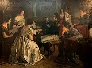Pedro Américo was born in 1843, in the Paraíba Province of Brazil, more specifically in the now municipality of Areia, at the time the small town of Brejo d'Areia. Since his youth, he showed a vocation for painting, being 10 years old when he participated as a drawer of flora and fauna in a scientific expedition through Northeastern Brazil led by the French naturalist Louis Jacques Brunet. At approximately 13 years old, he entered the Imperial Academy of Fine Arts, in the city of Rio de Janeiro. His performance at the academy made him known even to Emperor Pedro II, who sponsored a trip to Paris and studies at the École nationale supérieure des Beaux-Arts, where the artist perfected his style, mainly in historical painting. His most famous work, Independence or Death (Portuguese: Independência ou Morte), was shown for the first time in the Accademia di Belle Arti di Firenze (Academy of Fine Arts of Florence) on April 8, 1888. After going to Brazil, remaining there for a few years, he returned to Florence, where he died in 1905.[2][3]