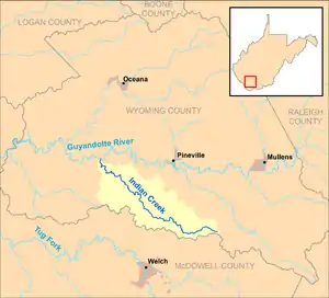 Indian Creek is a tributary of the Guyandotte River, 19.7 miles (31.7 km) long,[3] in southern West Virginia in the United States. Via the Guyandotte and Ohio rivers, it is part of the watershed of the Mississippi River, draining an area of 43 square miles (110 km2)[4] in a rural area on the unglaciated portion of the Allegheny Plateau.