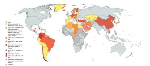Serious public insult (侮辱, wǔrǔ) by assault or other means is punishable by prison up to three years, intermediary detention up to six months or public surveillance up to two years.[37] If the insult by assault is too serious, it may be subsidiary to violent crimes instead. China has got the most conditions for criminal insult. In Macau, insult (Chinese: 侮辱, wǔrǔ, Portuguese: injúria) is punishable by prison up to three months or by a fine up to 120 daily units.[38]
