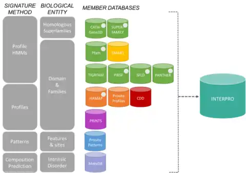 - Is large collection of multiple sequence alignments and hidden Markov models covering many common protein domains and families. The 13 member databases of the InterPro consortium grouped by their signature construction method and the biological entity they focus on.[6]