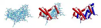 The IFN-γ monomer consists of a core of six α-helices and an extended unfolded sequence in the C-terminal region.[19][20] This is shown in the structural models below. The α-helices in the core of the structure are numbered 1 to 6.
