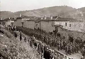 Captain Fabius established a volunteer artillery unit.[33] According to the Austrian government, the volunteers who bombarded the rebels were recruited by the Albanian Committee in Vienna.[34] Till the end of June 1914 Dutch officers were captured by rebels in most of the central Albania. They were gradually replaced with officers from Austria-Hungary and Germany, who arrived in Durrës on July 4.[1] On July 27, 1914 Colonel De Veer officially tendered the officers' resignations.[35] Soon the First World War broke out and by August 4 most of the officers had returned home. The rebels captured Berat on July 12 and Vlore, without fight, on August 21.[36] The last two captured officers (Verhulst and Reimers) were released on September 19, 1914.[37]
