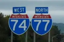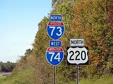 The 12.6-mile (20.3 km) portion from south of Steeds north to south of Ulah was completed August 27, 1996, and was the first road marked as I-74 (and I-73).[34] Future signage was also installed north to the Greensboro area.[35] The remainder of the 26 miles (42 km) of existing and new freeway between Ulah and Candor was also signed as I-73/I-74 along US 220. In 1998, NC 752, a freeway spur of I-77 was renumbered as the segment of completed I-74, from I-77 to US 601. On June 30, 1999, the freeway was extended an additional five miles (8.0 km) to US 52, south of Mount Airy. In April 2001, I-74 was overlapped with I-77 from the Virginia state line to exit 101.