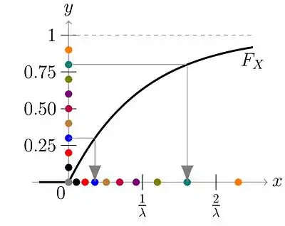 Random numbers yi are generated from a uniform distribution between 0 and 1, i.e. Y ~ U(0, 1). They are sketched as colored points on the y-axis. Each of the points is mapped according to x=F−1(y), which is shown with gray arrows for two example points. In this example, we have used an exponential distribution. Hence, for x ≥ 0, the probability density is and the cumulative distribution function is . Therefore, . We can see that using this method, many points end up close to 0 and only few points end up having high x-values - just as it is expected for an exponential distribution.
