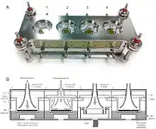 Top view of a Vitrocell mammalian exposure module "smoking robot", (lid removed) view of four separated wells for cell culture inserts to be exposed to tobacco smoke or an aerosol for an in vitro study of the effects