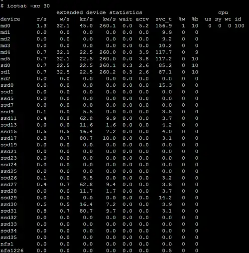displays output where each line (row) gives numerical data for one device. The first column lists the device name, and subsequent columns show various statistics for that device. Columns include the average service time (svc_t, which includes not only the time a request is in the service queue, but also the seek time and transfer time[2]), the average busy percentage (%b, essentially the proportion of time that the device is in use), and the percentage of time that the queue is not empty (%w, which means the proportion of time in which requests from the device have not yet been fulfilled).[1]