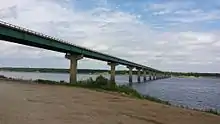 At Polk City, Iowa 415 turns to the west along West Bridge Road, which becomes NW 112 Avenue as it leaves Polk City and turns to the southwest. NW 112 Avenue crosses Saylorville Lake over the Mile Long Bridge. Northbound Iowa 415, heading southwest, intersects NW Beaver Drive just west of the western coast. It continues south and west for 1+1⁄2 miles (2.4 km) where it ends at a trumpet interchange with Iowa Highway 141 in Jefferson Township, east of Granger.[1]