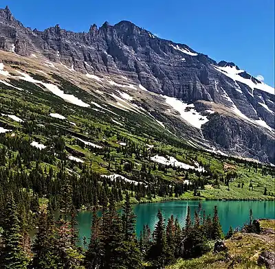 Like other mountains in Glacier National Park, it is composed of sedimentary rock laid down during the Precambrian to Jurassic periods. Formed in shallow seas, this sedimentary rock was initially uplifted beginning 170 million years ago when the Lewis Overthrust fault pushed an enormous slab of precambrian rocks 3 mi (4.8 km) thick, 50 miles (80 km) wide and 160 miles (260 km) long over younger rock of the cretaceous period.[6]