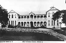 In 1887 a committee was formed to raise funds for the establishment of a girls' grammar school, and in 1890 the land for the current site of the school was granted by the trustees of Queen's Park in Ipswich. In the same year, George Brockwell Gill had been appointed architect and was contracted to design a school building for a cost of £3500. Tenders for construction were called in The Queensland Times on 21 Jan 1891 and contractors Worley and Whitehead were accepted with a tender of £3893. The foundation stone of the school was laid on 10 March 1891 by acting governor, Sir Arthur Hunter Palmer, K.C.M.G.[1] The architect of the original building, George Brockwell Gill, designed many of the grand residences and public buildings in Ipswich from the 1880s to the 1930s. Some of his works include "Brynhyfryd" for Lewis Thomas (1889/90), St Paul's Rectory (1895), the Ipswich Club House (1916), Ipswich Technical College (1901), and supervision of the construction of the Walter Burley Griffin Incinerator in 1936. Gill emigrated from London and settled in Ipswich in 1886 where he commenced work as an architect for the firm of Samuel Shenton. Gill took over Shenton's practice in 1889 when Shenton retired. Gill had been elected Associate of the Queensland Institute of Architects in 1904 and Fellow by 1913. He was its vice-president in 1914-16 and president in 1918–19. Gill was also a member of the board of trustees for the school and on his retirement in 1948 he was the chairman of the board of trustees.[1]