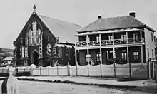 A two-storey parsonage was built by Samuel Shenton to the north of the church in 1864. The building was damaged by fire in 1920 and subsequently renovated, then was extended forward and very extensively altered in 1958 to convert it to offices known as Wyvern House.[1]