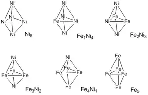 Iron–nickel (Fe–Ni) clusters are metal clusters consisting of iron and nickel, i.e. Fe–Ni structures displaying polyhedral frameworks held together by two or more metal–metal bonds per metal atom, where the metal atoms are located at the vertices of closed, triangulated polyhedra.[1]