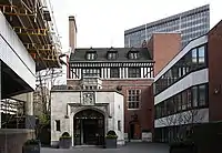 Ironmongers' Hall is the home of the Worshipful Company of Ironmongers. It is located in Aldersgate Street in the City of London. The first hall, dating back to 1457, was in Fenchurch Street; it was rebuilt in 1587 and rebuilt again in 1745 on the same site.[3] The third hall was destroyed on 7 July 1917 by a bomb dropped during World War I.[3] The present Hall stands on land which was bought in 1922: construction work, which was undertaken by Holland, Hannen & Cubitts,[4] started that year and the Hall was opened on 17 June 1925.[3]