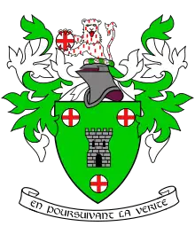 - (Arms) Vert a Tower Proper between three Roundels Argent each charged with a Cross Gules.