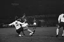 Charlton developed a new ploy for the 1967–68 season by standing next to the goalkeeper during corners to prevent him from coming out to collect the ball; this created havoc for opposition defences and is still a frequently used tactic in the modern era.[41] However, for the second successive season Leeds finished fourth and exited the FA Cup at the semi-finals, this time losing 1–0 to Everton at Old Trafford. They finally won major honours by beating Arsenal 1–0 in the final of the League Cup; Terry Cooper scored the only goal of the game despite allegations that Charlton pushed goalkeeper Jim Furnell in the build-up to the goal.[42] Leeds then went on to lift the Inter-Cities Fairs Cup after beating CA Spora Luxembourg, FK Partizan (Yugoslavia), Hibernian (Scotland), Rangers (Scotland) and Dundee (Scotland) to reach the final with Hungarian club Ferencvárosi.[43] They won 1–0 at Elland Road and drew 0–0 in Budapest to claim their first European trophy.[42]