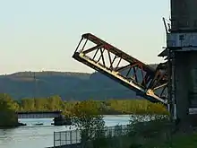 The Jackknife (or Jack-knife) Bascule Bridge is a bascule bridge that spans the Kaministiquia River at Thunder Bay, Ontario, Canada, to link the city to Mission Island, one of two islands in the Kaministiquia River delta. The bridge was built by the Canadian Pacific Railway between August 1910 and April 1913. The contractor for the abutments and piers was Alexander Charles Stewart (1867–1944). The bridge had two decks, the lower deck for trains and the upper deck for vehicular road traffic.