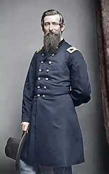 Jacob G. Frick became one of the early responders to President Abraham Lincoln's call for volunteers to help preserve his nation's union following the April 1861 fall of Fort Sumter to Confederate States Army. On September 23 of that year, at the age of 36, he enrolled for Civil War military service in Pottsville, Pennsylvania, and officially mustered in there that same day with the field and staff officers' corps of the 96th Pennsylvania Infantry. Commissioned as a lieutenant colonel, he served as his regiment's second in command,[6] and participated with his regiment in the Seven Days Battles from June 25—July 1, 1862, including the battles of Gaines's Mill (June 27), Glendale (June 30) and Malvern Hill (July 1).[7]