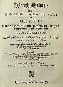 Sir Dudley Carleton, English ambassador in The Hague, made a speech against the Remonstrants to the States-General of the Netherlands (6 October 1617).[5] Taurinus subjected this oration to criticism in the anonymous Weegh-schael (The Balance),[6] after consulting Johan van Oldenbarneveldt. Carleton was taken to task for acting inconsistently with the wishes of his royal master.[7] Carleton in November asked the States General on 22 November for the author to be punished; and was informed in December by Matthew Slade that the pamphlet had been written by Taurinus.[5] Carleton pursued the matter vigorously, brought up several stringent demands, and made the French translation a target also.[8] The French version was by Carolus Niellius, and included a satirical introduction.[9]