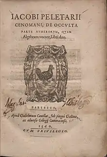 Jacques Pelletier du Mans, also spelled Peletier (Latin: Iacobus Peletarius Cenomani, 25 July 1517 – 17 July 1582) was a humanist, poet and mathematician of the French Renaissance.[1]