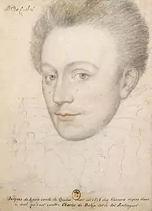 Jacques de Lévis, comte de Caylus (c. 1554–29 May 1578)[1] was a French noble and favourite of King Henri III during the French Wars of Religion. Coming from a prominent Rouergue family, Caylus entered court life when dispatched by his father, the seneschal of Rouergue to court in 1572 to inform King Charles IX of the failure of the sieges of Montauban and Millau. The following year he began his association with the king's brother Anjou, future Henri III, fighting under his command during the siege of La Rochelle. With Anjou's election as king of the Commonwealth, Caylus travelled with his new patron to the country, being elevated to the position of 'gentleman of the chamber' in Anjou's capacity as king of the Commonwealth.