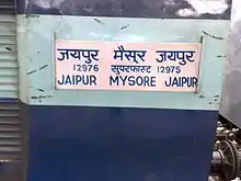 The 12975 / 12976 Jaipur–Mysore Superfast Express is Superfast Express train belonging to Indian Railways that runs between Jaipur Junction and Mysore Junction in India.