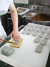 First, the heads, viscera and scales of the fish are removed. Then, the remaining parts are minced including the bones. Seasoning is added and the minced fish is ground into a paste. Next, it is shaped into rectangular patties by using a wood frame. The patties are fried for several minutes until they become brownish. The pieces of jakoten are now ready.