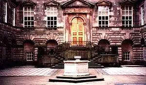 In the early 1720s, Leoni received one of his most important challenges: to transform a great Elizabethan house, Lyme Hall, into a Palladian palace.[6] This he did so sympathetically that internally, large areas of the house remained completely unaltered, and the wood carvings by Grinling Gibbons were left intact. In the central courtyard Leoni achieved the Palladian style by hiding the irregularities and lack of symmetry of the earlier house in a series of arcades around the courtyard.