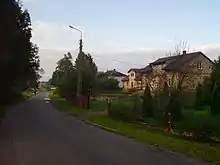 Main road passing through Jamiołki-Świetliki. White traffic sign at the right already delimits the next village, Jamiołki-Piotrowięta.
